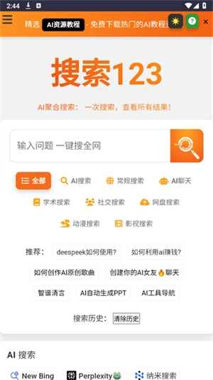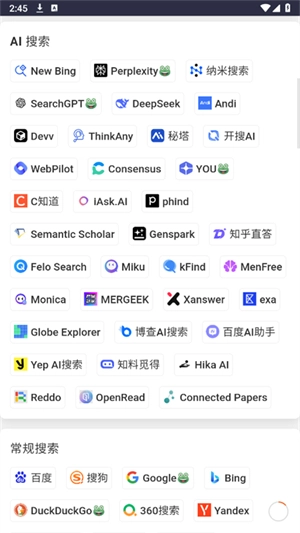 2. 同时对多种搜索引擎类型进行检索,其中包括AI搜索、常规搜索以及学术搜索等。