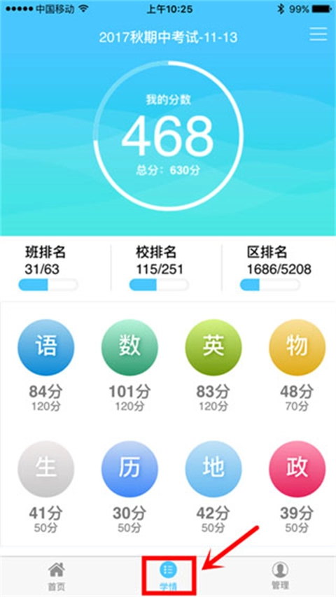 4、登录后,点击底部学情菜单,就可以查看到各科的成绩,如图。