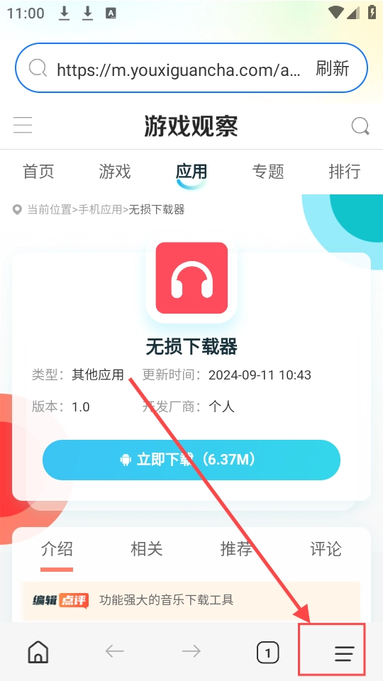1. 打开任意一个网页后,于屏幕右下角找寻并点击菜单按钮(图标为三条横线) 。