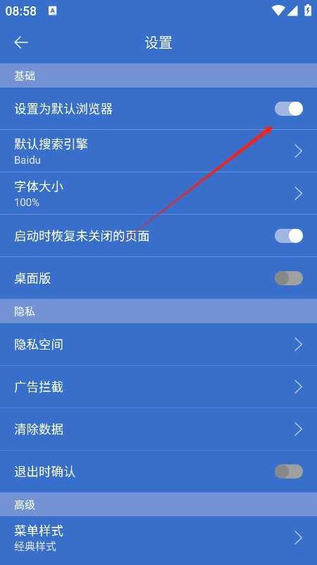 4. 在设置界面,你不仅能够将软件设为默认浏览方式,还能够切换搜索引擎。