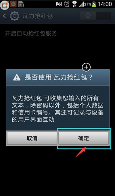 3、开启“瓦力抢红包”时,系统会给出一些风险警告,不过无需担忧,瓦力抢红包不会保存您的任何密码。其记录仅仅是为了收录诸如QQ、微信等能抢红包的平台,就好比一个外挂后台。您只需点击【确定】,便可开启轻松抢红包之旅。