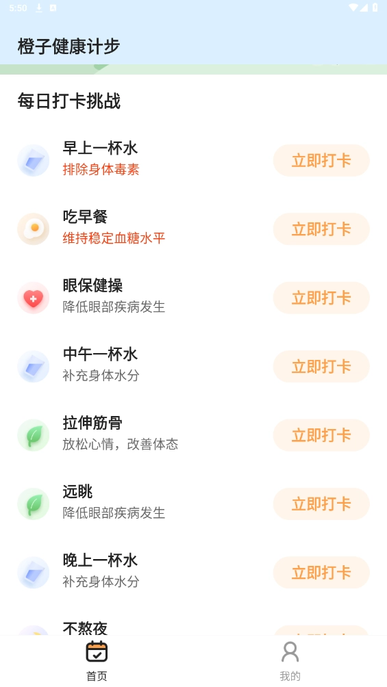 橙子健康计步,除计步功能外,还具备喝水提醒、早睡提醒、护眼提醒等功能。它会定期提醒您补充充足的水分、保证足够的睡眠、适时放松,助您维持身体健康,保持精神愉悦。