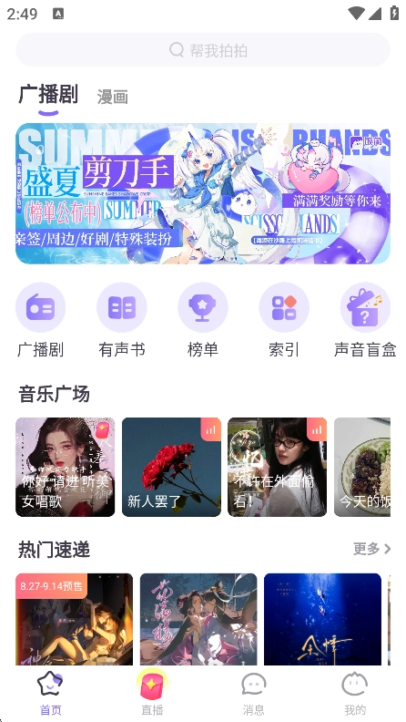 1、打开首页,便能看到各类功能以及广播剧。