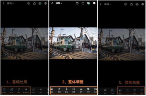 LR深知自身功能繁多,而手机屏幕空间有限,整体看起来较为复杂。因此,它将软件底部的所有功能按板块进行呈现,共分为3个板块,每个板块之间以黑线加以区隔。