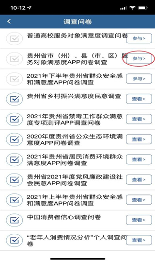 3、接着点击右侧带有参与按钮的可参与问卷调查资料,已完成或仅可查看的问卷无法参与,若调查活动已结束也不可参与。