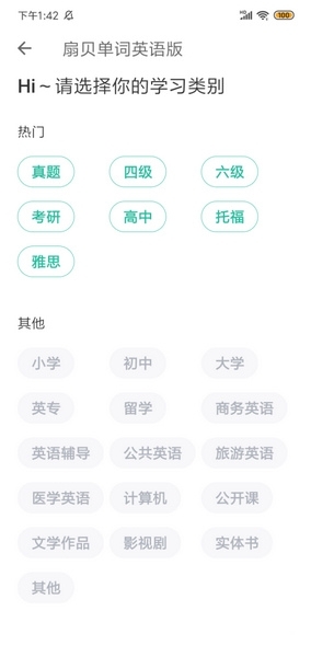 1. 新用户进入后会看到单词书推荐页面,能依据分类标签的指引,挑选自己想要学习的单词书。