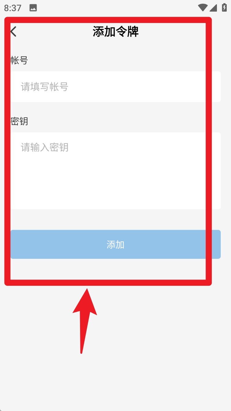 3. 要是选择手动添加,需填写账号及密钥信息,确认准确无误后,点击「添加」以完成操作。