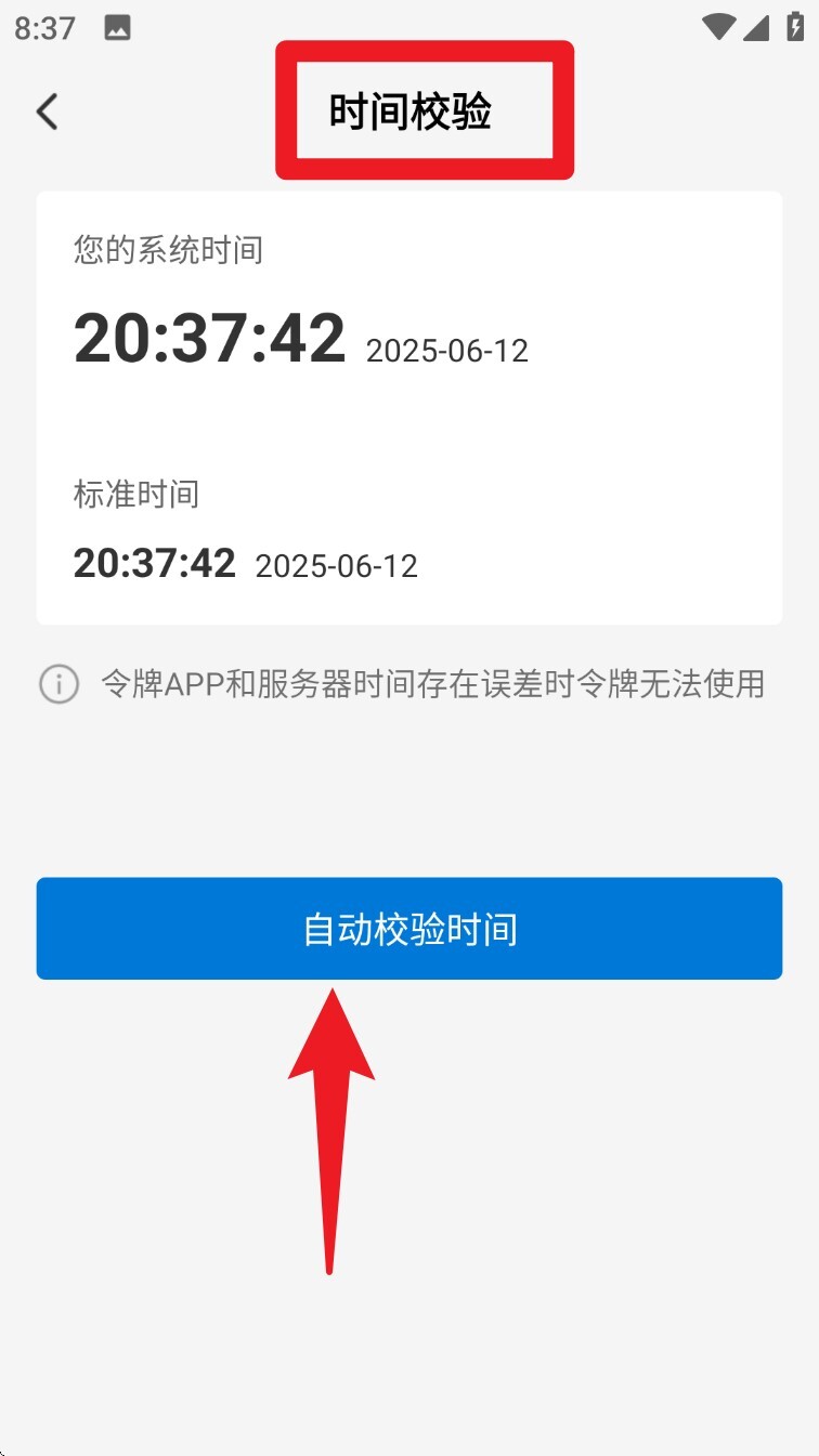 5. 轻点「自动校验时间」按钮,以保障验证码生成的精准度,防止因时间偏差引发错误。