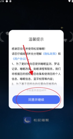 1、安装完成后,启动松鼠睡眠,您会看到温馨的提示信息,选择同意并继续,就能开始使用。