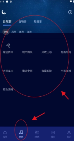 3、接下来点击助眠栏目,这里提供多种类型的助眠音,包括自然音、白噪音等,快来选择您最喜欢的吧!