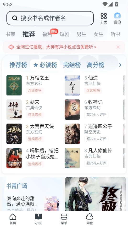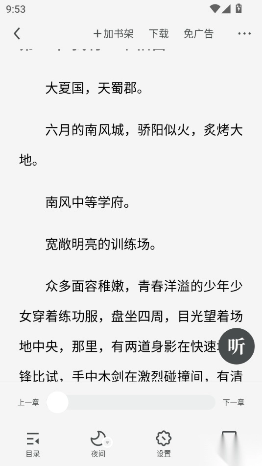 4. 小说阅读板块:界面简洁清爽,字体与亮度皆能按需调节,同时还具备听书功能。