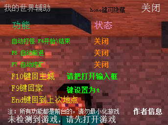 我的世界辅助器是一款精心为minecraft制作的游戏辅助,默认i键打开背包,右侧出现修改栏,可以实现自动挖矿、自动打怪、回家等等功能。是为您节省时间快乐游戏的给力工具。