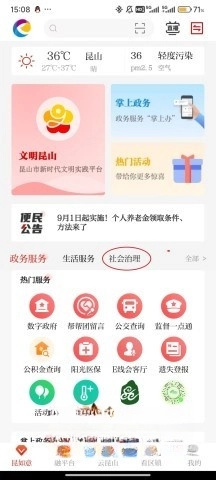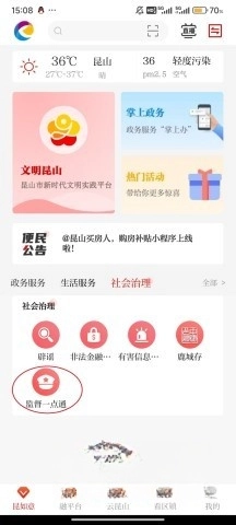 1、点击屏幕中间的“社会治理”。