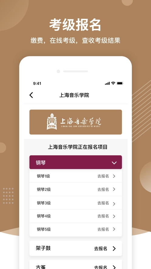 上音考级是一款学习和教育软件。该软件是专门为艺术类学生设计的。众所周知,艺术学生需要不断地取得一些证书和成绩。通常,在申请成绩或证书时,可能需要经过很多繁琐的步骤,这个软件可以帮助用户非常快速地注册。