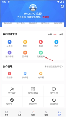 1. 首先输入手机号码以及接收到的验证码,登录软件。登录后会默认跳转到首页,首页上有海量的房源信息供您浏览。之后切换至“我的”页面,在“我要发布”选项中选择我的房源管理。