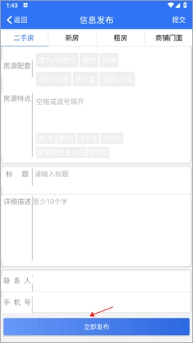 3、在房源信息表内填妥所有相关信息,随后点击“立即发布”,稍作等待,你的房源信息就会展示在首页。