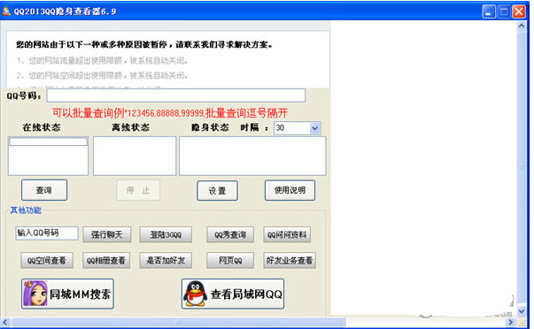 qq隐身查看器2013是一款可以查看QQ隐身人员的多功能集合软件,它可以让您QQ上的潜水一族完全裸露在你面前。还有强制聊天、qq好友业务、网页QQ等等功能,欢迎下载体验。