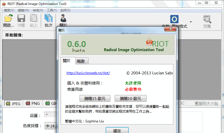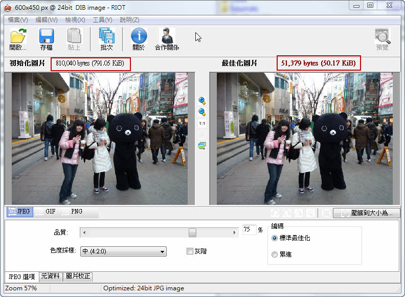 RIOT全称为Radical Image Optimization Tool,是一款 Windows 下的优秀免费的图片优化压缩工具。它通过调整一系列参数,在尽量保证图片质量的情况下,缩小图片体积。软件采用了双预览窗口,你可以自己调整压缩率并实时看到图片压缩后的品质。这是轻量级,快速和简单的使用,但高级用户功能强大。 您将能够控制压缩,颜色数量,元数据设置等等,并为您的输出文件选择图像格式(JPG,GIF或PNG)。【软件特点】