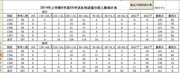 EXCEL成绩统计1分钟是用excel电子表格制成,使用“宏命令”完成学生成绩自动统计功能的EXCEL学生成绩自动统计程序,操作简单易懂。分享给学校成绩统计的各位同行,这个东东可以减轻你的负担,轻点鼠标自动生成报表,统计包括两率一分、分数段、名次段。。。【操作说明】