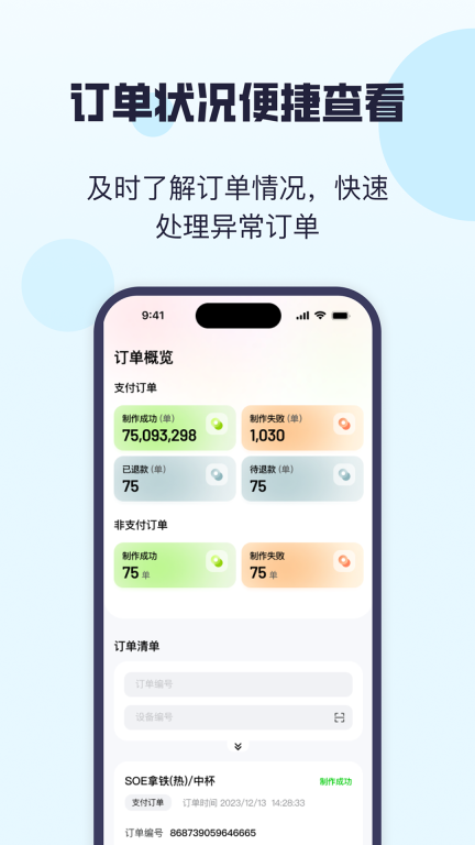 2、可以实时看到订单的一个状况,例如实际制作成功了多少单,有多少杯是退款的,以及还有多少杯处在退款中,还支持查询具体订单编号,查看的非常详细了!