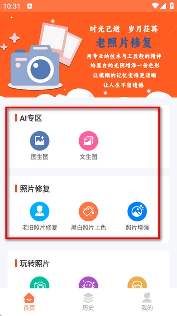 2、软件不仅专注于照片修复功能,还加入了多种趣味玩法和个性化的编辑工具,旨在满足用户日益多样化的需求。