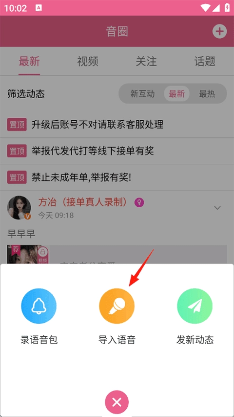 3、也可在首页点击“发布作品”,于弹出的列表里选择“导入语音条” 。