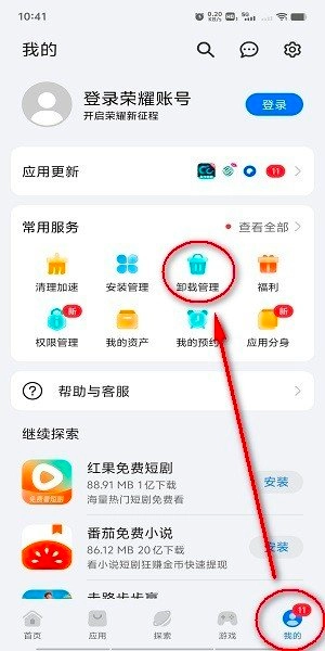 打开应用市场后,点击右下角“我的”,并点击“常用服务”里面的“卸载管理”;