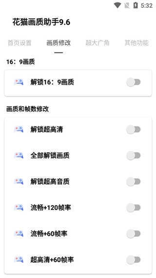 2、点击画质修改,玩家能够使用解锁16:9画质、解锁超高清、全部解锁画质、解锁超高音质、流畅+120+60帧率、超高清+60帧率等功能。