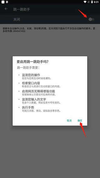 3、点击跳一跳助手,随后开启服务并点击确定。