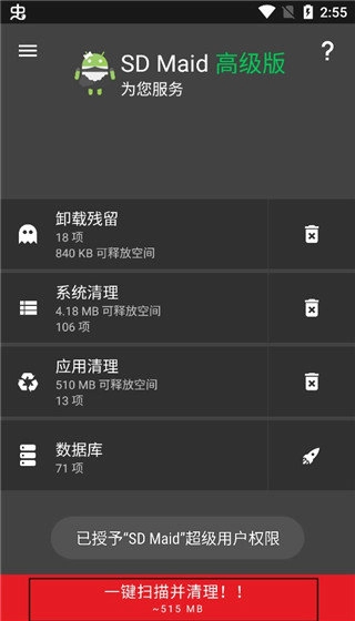 残留文件或目录指的是已卸载应用所遗留下来的文件。SD Maid这款软件会对您的SD卡以及存储进行扫描,然后将扫描结果与您已安装的应用和内部数据库作对比。