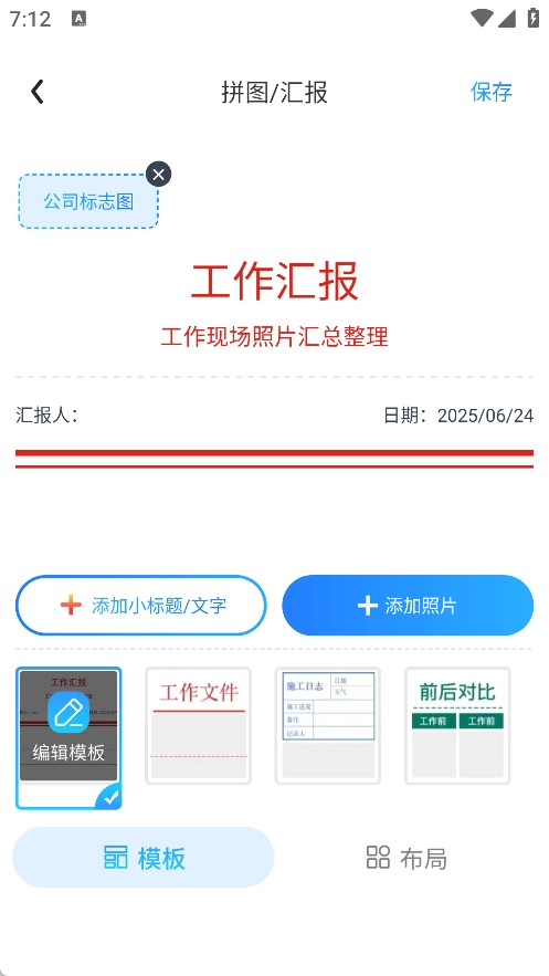 2、在拼图汇报里面可以进行添加公司的标志图,然后写工作汇报的信息和时间,再添加小标题/文字,添加照片,选择模板进行制作即可。