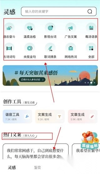 2. 进入主页后,可点击页面正上方的分类标签,查看相应类型的文案;也能够浏览下方由系统推荐的热门文案。