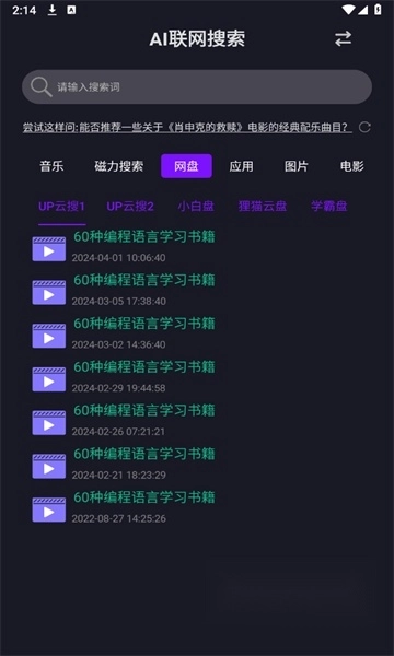 点击搜索按钮,App会开始搜索相关的资源,并在下方展示搜索结果。