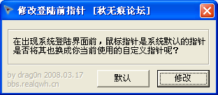 【概括介绍】修改登陆前指针小巧方便的鼠标指针修改器。软件操作简单,只需按下修改就会自动替换掉系统默认的指针,有多款指针供您选择,欢迎下载使用。
