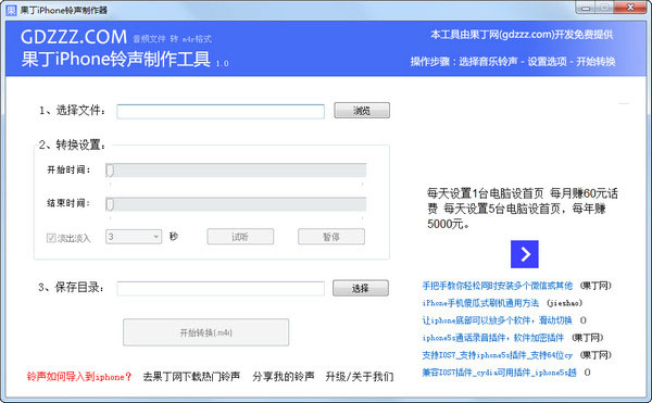 【概括介绍】果丁iPhone铃声制作是一款苹果铃声制作工具,可以将苹果手机上的mp3等各种音频格式修改为苹果专用铃声格式m4r,非常简洁方便。【使用方法】1.选择需要剪切的铃声2.设置剪切时间,转换3.保存目录