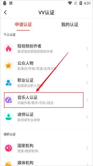 4、随后,点击“音乐人认证”。