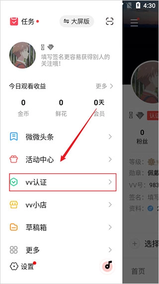 3、随后在弹出的侧边页面里,点击“vv认证”。