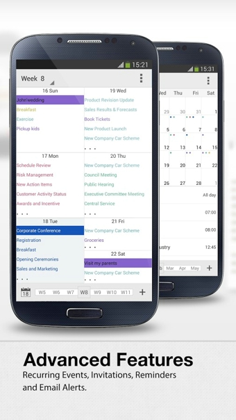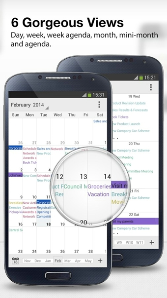 CalenMob支持6个标准视图 - 日,周,周日程,月,迷你月和议程。可以瞬间切换视图来发现事件或找到你正在寻找一个时间。