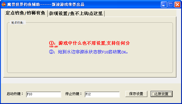 【概括介绍】魔兽钓鱼辅助是针对wow里的钓鱼所设计的一款辅助工具。主要有定点钓鱼和钓稀有鱼类两个功能。设置好辅助挂在那里就不用管了,是您节省时间快乐游戏的好帮手,还可以帮您调到稀有宠物哦!