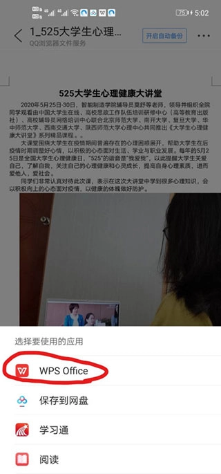 6、当选择用其他应用打开时,会弹出应用选择界面,在此界面中选择WPS Office(此操作需要手机安装有手机版WPS,若未安装,可在手机应用商店中查找并下载)。