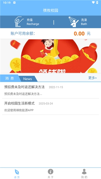 1、在软件的首页,我们可以看到自己的账户余额以及各类报修消息等。