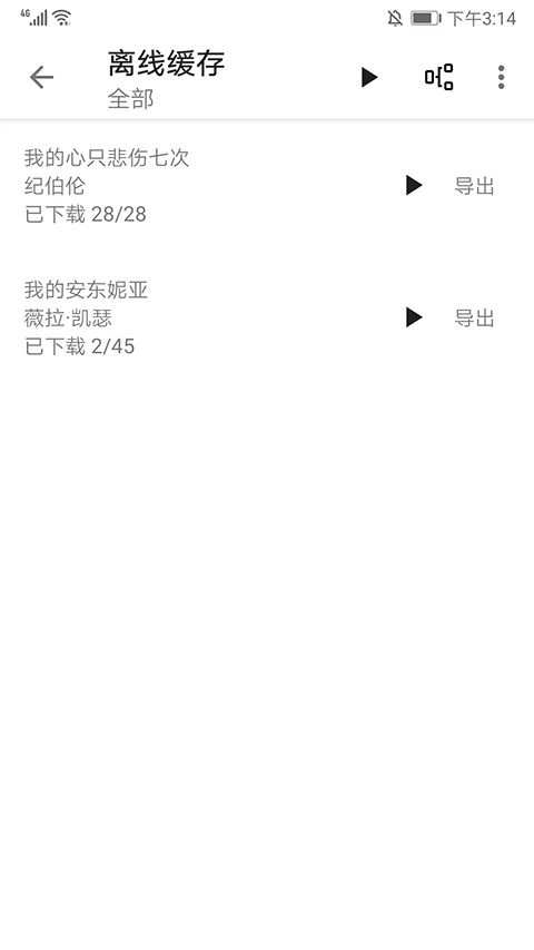 2、当进入缓存界面后,在其中找寻你想要缓存的小说,像《我的心只悲伤七次》,然后点击该小说后面的【导出】按钮。