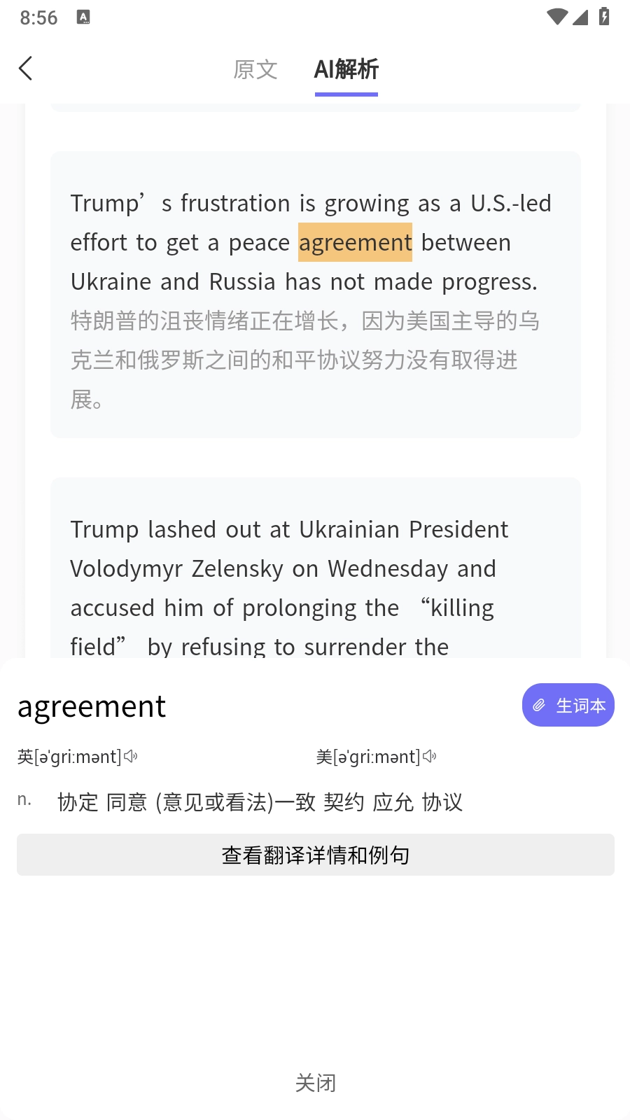 2. 阅读文章过程中,若碰到不熟悉的单词,长按该单词,随后在弹出的选项里,点击“添加到生词本”按钮。