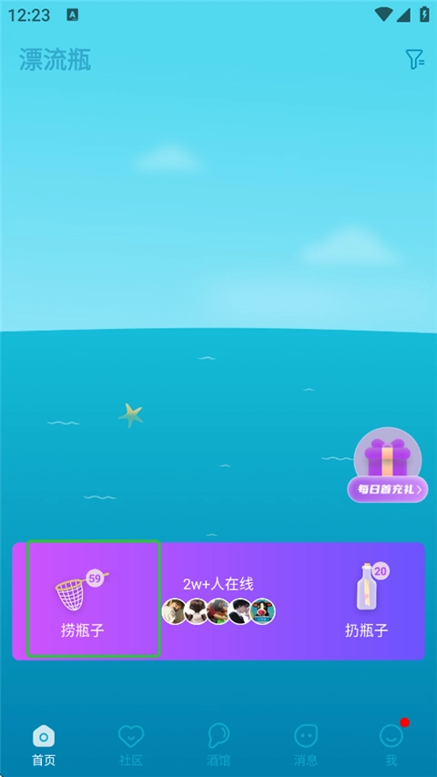 1、打开正宗漂流瓶,在首页点击捞瓶子。
