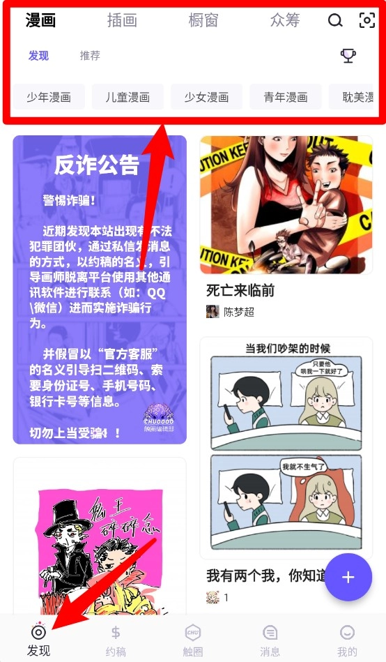 2、“发现”页面设有多种漫画题材分类标签,助力用户便捷浏览心仪的作品内容。
