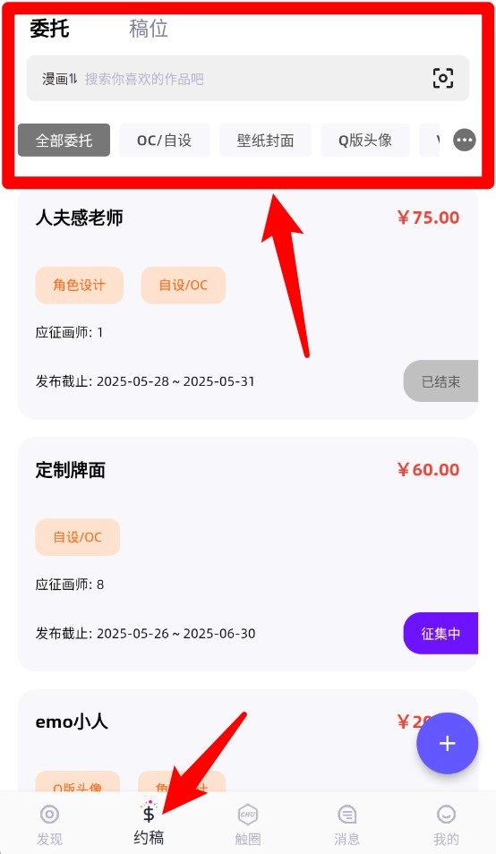 3、“约稿”板块提供多种委托类型供您选择,让您能轻松发布任务,进而筛选出合适的画师开展定制合作。