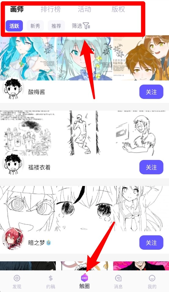 4、“触圈”社区汇聚了众多画师的作品以及互动内容,能实现筛选、推荐功能,还支持用户关注心仪的创作者。