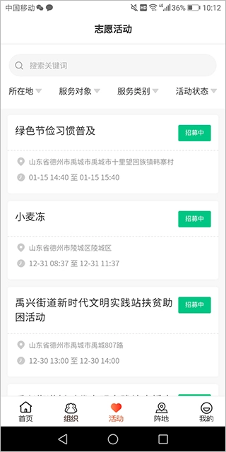 3、在页面底部,可将导航栏切换到【活动】,打开的页面里能看到最新的志愿活动以及周边的志愿活动。