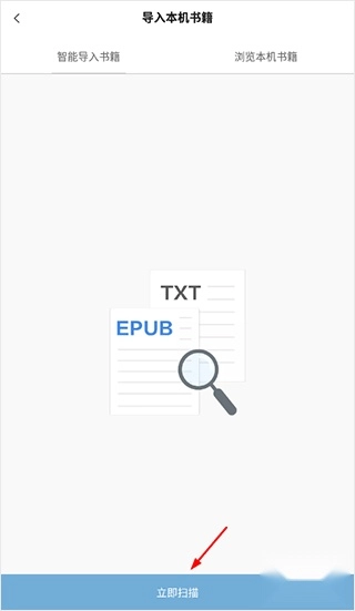 4、轻点“立即扫描”按钮,系统便会自动查找设备里的电子书文件。