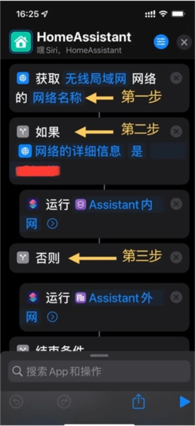 第一步,使它获取当前手机连接的局域网名称,也就是wifi名称。若当前名称与家里的wifi名称一致(参考图中第二步),表明此刻我在家,这时就通过局域网IP访问HA(我在此处直接启用了之前设置的快捷指令,实际上仅需使用「打开url」指令,并在url栏填写HA的局域网IP就行)。反之,就执行图中第三步,即访问域名:https://XXX:8123(XXX代表域名)。完成设置后,把该快捷指令以小组件的形式添加到手机主屏幕。如此一来,不管在家与否,只需轻点一下,就能进入HA界面,相较于每次都在地址栏输入网址,便捷许多。